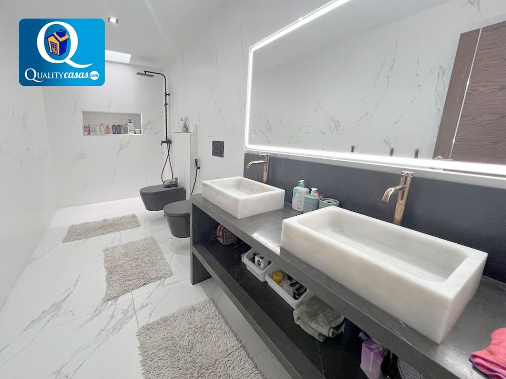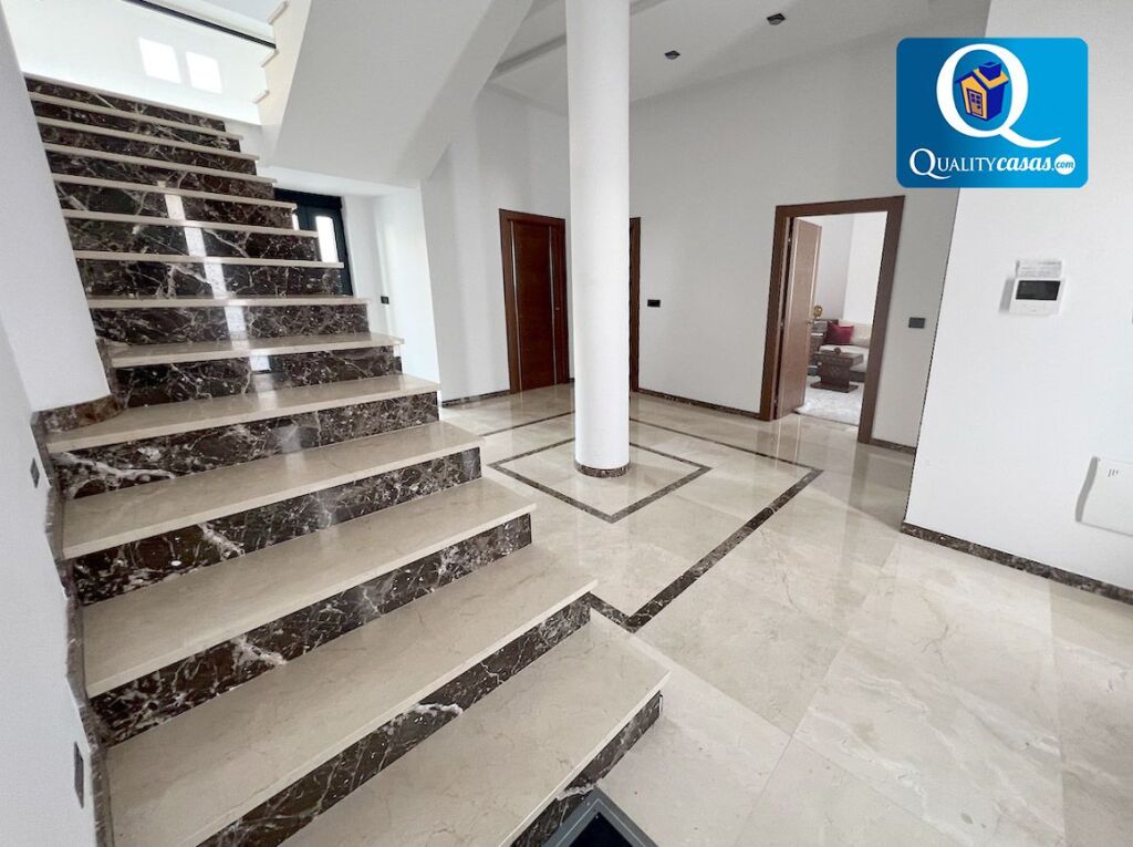 De excelente diseño y magnífica construcción de primer nivel, su estado es impecable y se reviste de altas calidades, contando con suelos de mármol, granito y gres porcelánico, techos en cámara de pladur con iluminación integrada, AA.CC con 8 splits y bomba de calor, puerta blindada, videoportero, barandillas de cristal reforzado en todas las terrazas, mosquiteras, rejas, toldos, carpintería reforzada de roble macizo, instalación de energía solar fotovotaica, aerotermia, suelo radiante en toda la vivienda y ventanas pvc climalit, entre otras muchas mejoras.