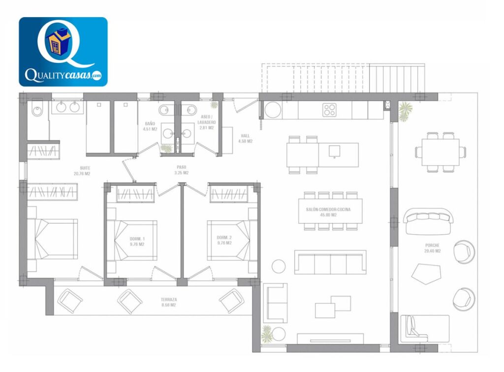 El amplio porche terraza da paso espacioso salón principal con dos orientaciones y dos ambientes, desde donde podemos contemplar el jardín y la piscina. La espaciosa cocina, con vistas exteriores e isla central, se encuentra totalmente equipada y amueblada, integrándose en el luminoso salón. La vivienda cuenta con 1 aseo, 2 baños completos (uno en suite) y tres amplias habitaciones con armarios empotrados. La gran terraza solárium en planta superior es ideal durante todo año, para tomar el sol o contemplar el atardecer.