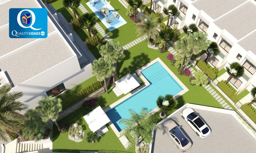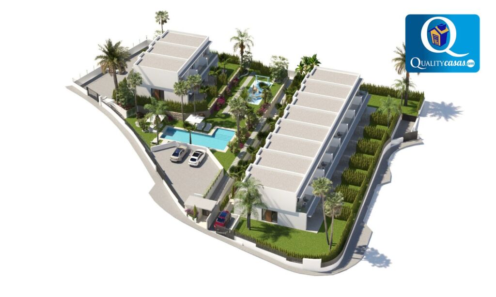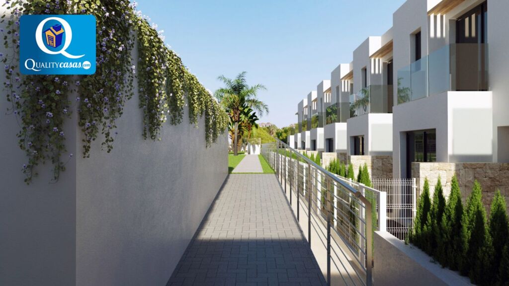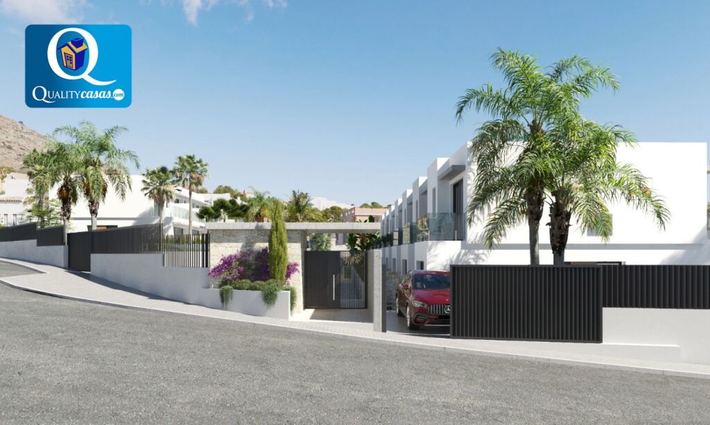 Un excelente chalet adosado de nueva construcción en magnífica zona residencial de Finestrat (Golf Bahía), muy bien localizado y con vistas a zonas verdes, el mar y la montaña, con las playas de Benidorm y la Cala de Finestrat al fondo. Dispone de urbanización privada con zona comunitaria ajardinada, parking y piscina para adultos y niños.