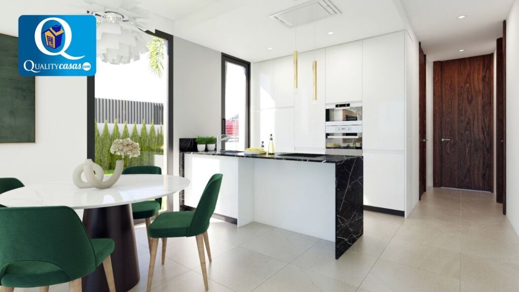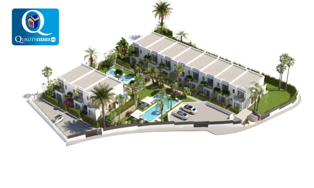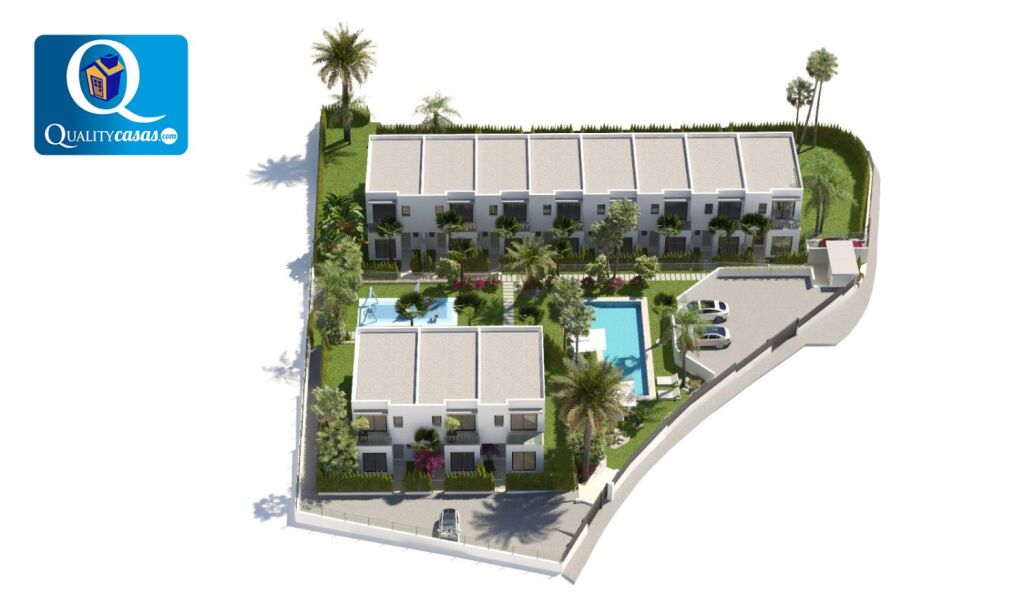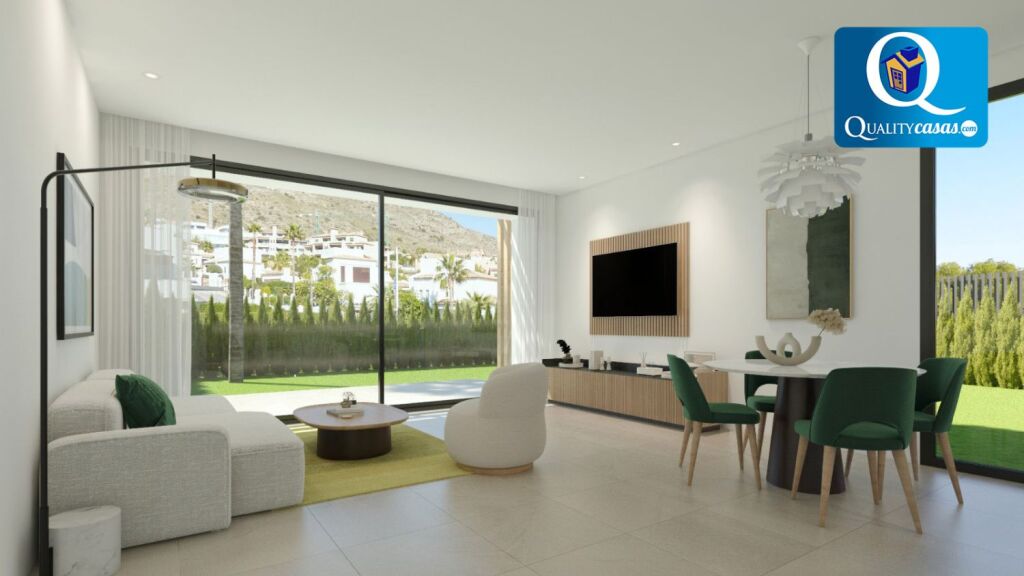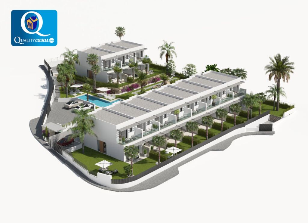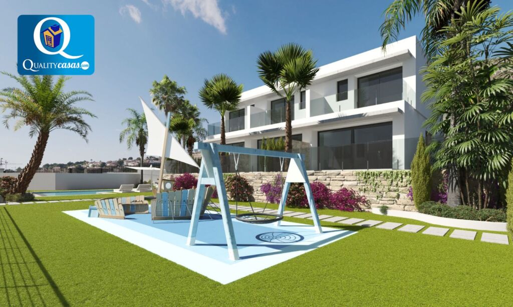 Un excelente chalet adosado de nueva construcción en magnífica zona residencial de Finestrat (Golf Bahía), muy bien localizado y con vistas a zonas verdes, el mar y la montaña, con las playas de Benidorm y la Cala de Finestrat al fondo. Dispone de urbanización privada con zona comunitaria ajardinada, parking y piscina para adultos y niños.
