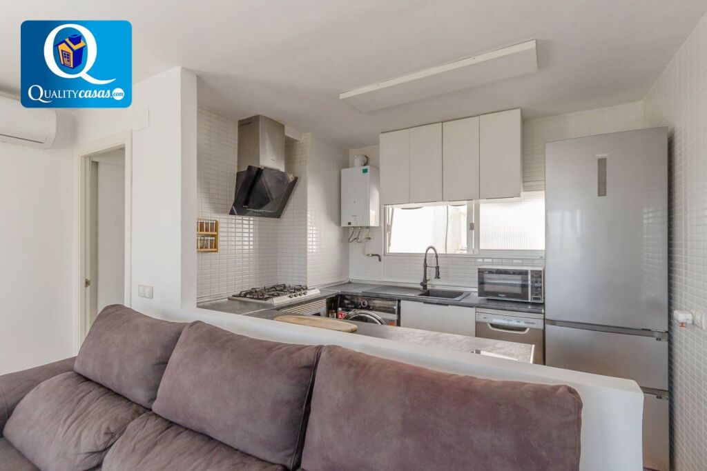 El amplio y luminoso salón se comunica con la extraordinaria terraza de la vivienda, con dos orientaciones y más de 55 m2, que se encuentra totalmente acondicionada, con toldos integrales y magníficas vistas despejadas y al mar. La cocina office, totalmente equipada y con electrodomésticos, se integra en el salón, compartiendo su luminosidad. La vivienda dispone de 1 dormitorio (con armarios empotrados y comunicado a la terraza) y 1 baño completo.