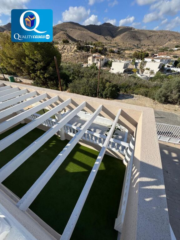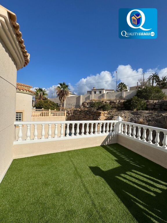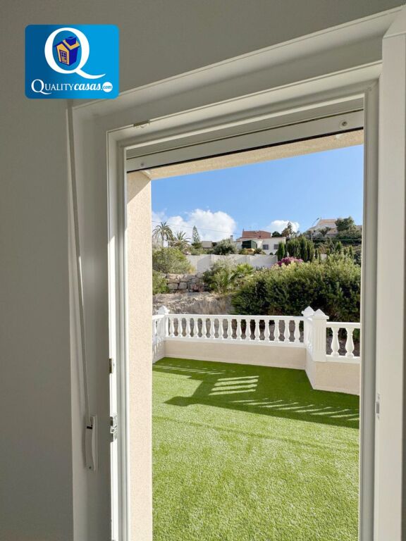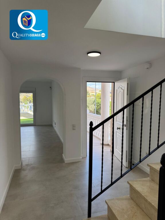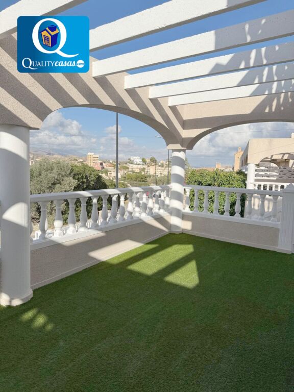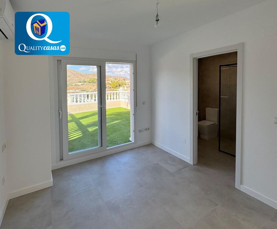 El porche terraza da paso al luminoso hall y el espacioso salón principal con dos orientaciones y dos ambientes, desde donde podemos contemplar el jardín. La moderna cocina, integrada en el salón, disfruta de vistas exteriores y zona de office, se encuentra totalmente equipada y cuenta con todos los electrodomésticos. La vivienda dispone de 3 dormitorios con armarios empotrados y 2 baños completos, uno de ellos en suite. Dos de los dormitorios tienen acceso a la terraza de la primera planta, con dos orientaciones. Cuenta además de magnífica terraza solárium en planta superior, disfrutando todas las zonas de terraza de excelentes vistas al mar y la montaña. Dispone además de garaje privado con acceso a la vivienda y amplio trastero.