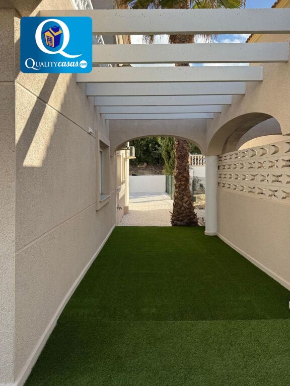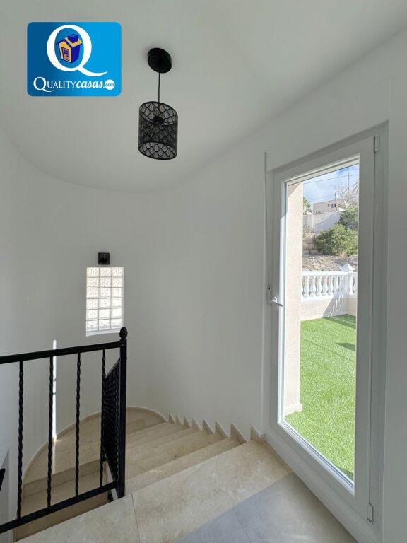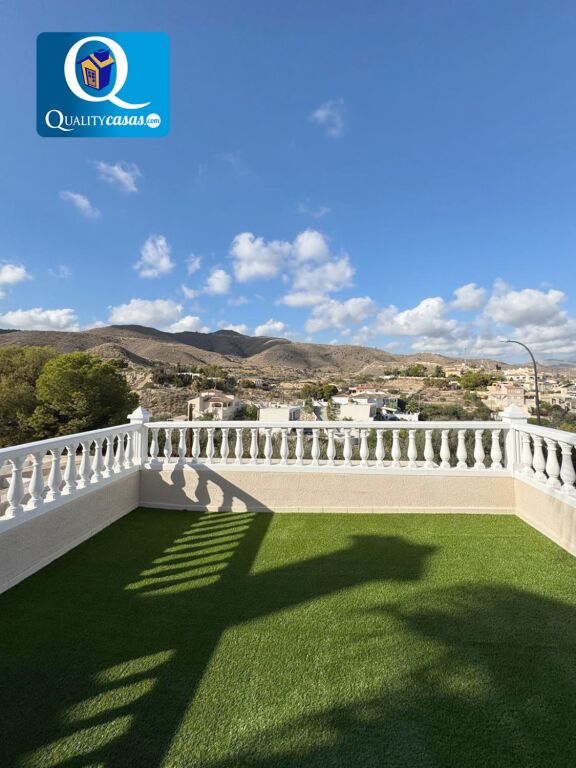 El porche terraza da paso al luminoso hall y el espacioso salón principal con dos orientaciones y dos ambientes, desde donde podemos contemplar el jardín. La moderna cocina, integrada en el salón, disfruta de vistas exteriores y zona de office, se encuentra totalmente equipada y cuenta con todos los electrodomésticos. La vivienda dispone de 3 dormitorios con armarios empotrados y 2 baños completos, uno de ellos en suite. Dos de los dormitorios tienen acceso a la terraza de la primera planta, con dos orientaciones. Cuenta además de magnífica terraza solárium en planta superior, disfrutando todas las zonas de terraza de excelentes vistas al mar y la montaña. Dispone además de garaje privado con acceso a la vivienda y amplio trastero.