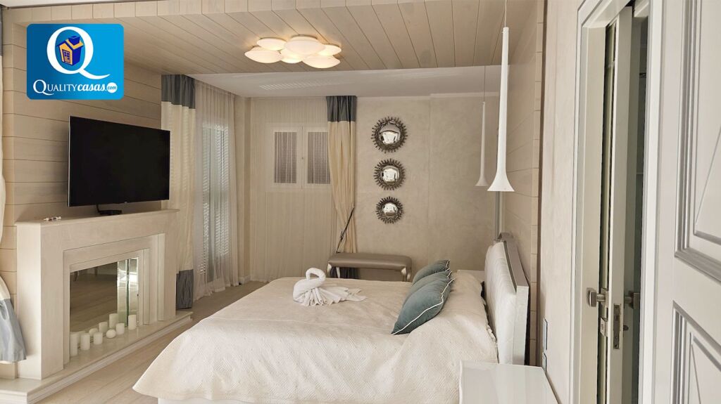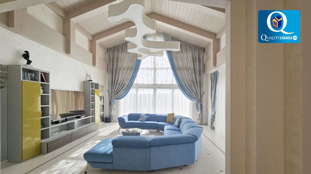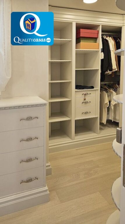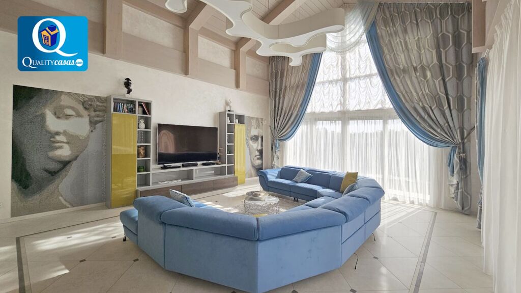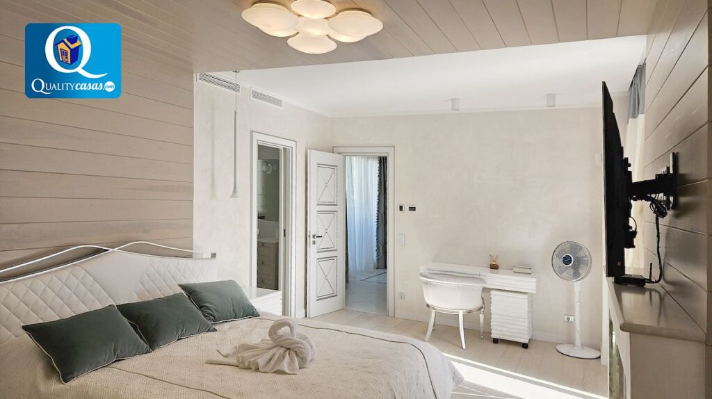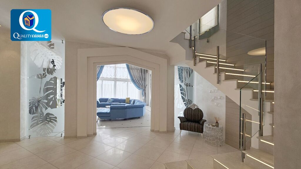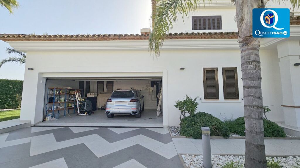 El elegante hall da paso al espacioso y totalmente luminoso salón con dos ambientes y techos de doble altura, con amplios ventanales integrales desde donde podemos contemplar el paisaje o reunirnos junto a la chimenea. La moderna cocina, con amplia zona de office, se encuentra totalmente equipada, cuenta con electrodomésticos de última generación y dispone de cuarto de lavado y plancha. La vivienda cuenta con 5 amplios dormitorios con armarios empotrados (dos de ellos con baño en suite y el principal con cuarto vestidor y terraza exterior con vistas panorámicas al mar). Dispone de 5 baños completos y cuenta además con trastero, garaje cerrado dentro de la vivienda y zona de parking en la parcela.