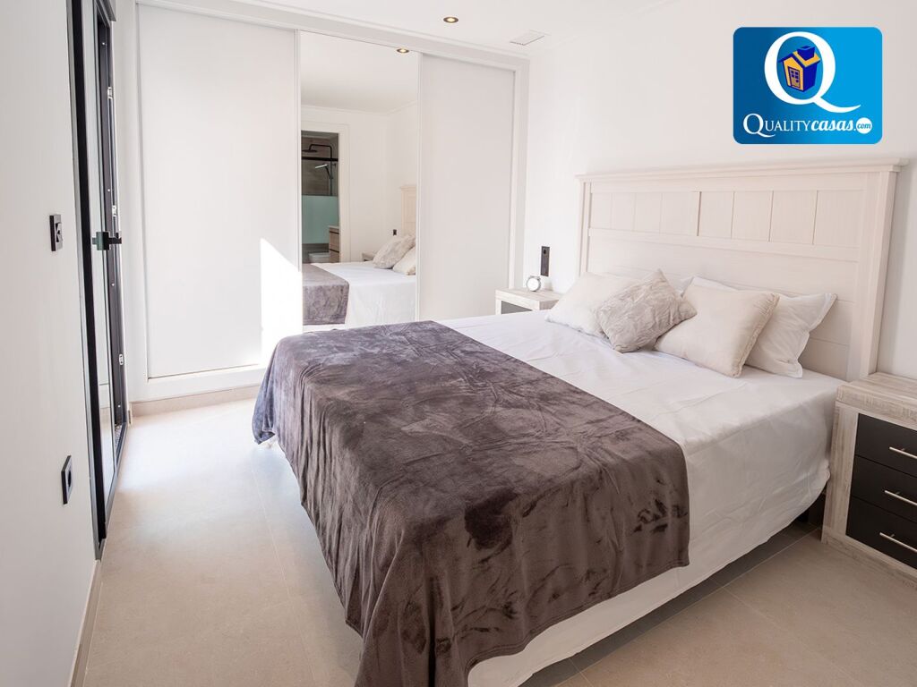 El amplio y luminoso salón cuenta con dos ambientes y amplios ventanales con vistas a la zona de piscina. La cocina office, con vistas exteriores, se encuentra totalmente amueblada y dispone de campana extractora y encimera de cuarzo. La vivienda dispone de 3 habitaciones con armarios empotrados y 2 baños completos, disponiendo el dormitorio principal de baño en suite y terraza exterior. Cuenta además de amplia terraza solarium en planta superior, con grandes posibilifdades.