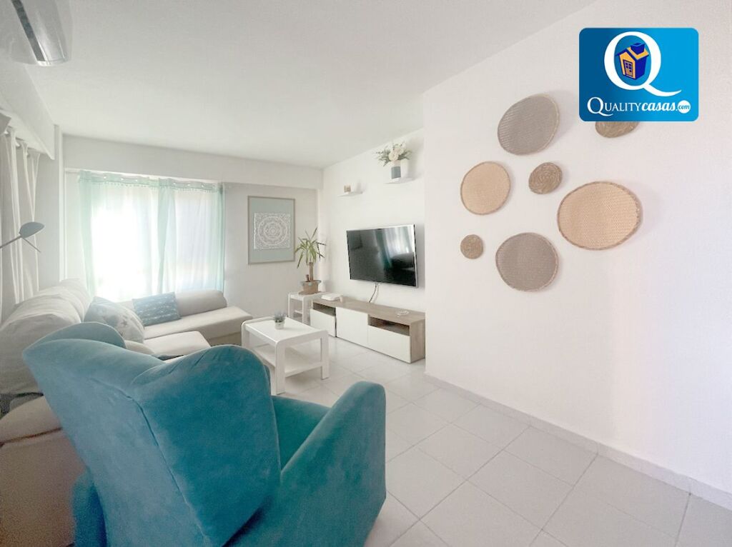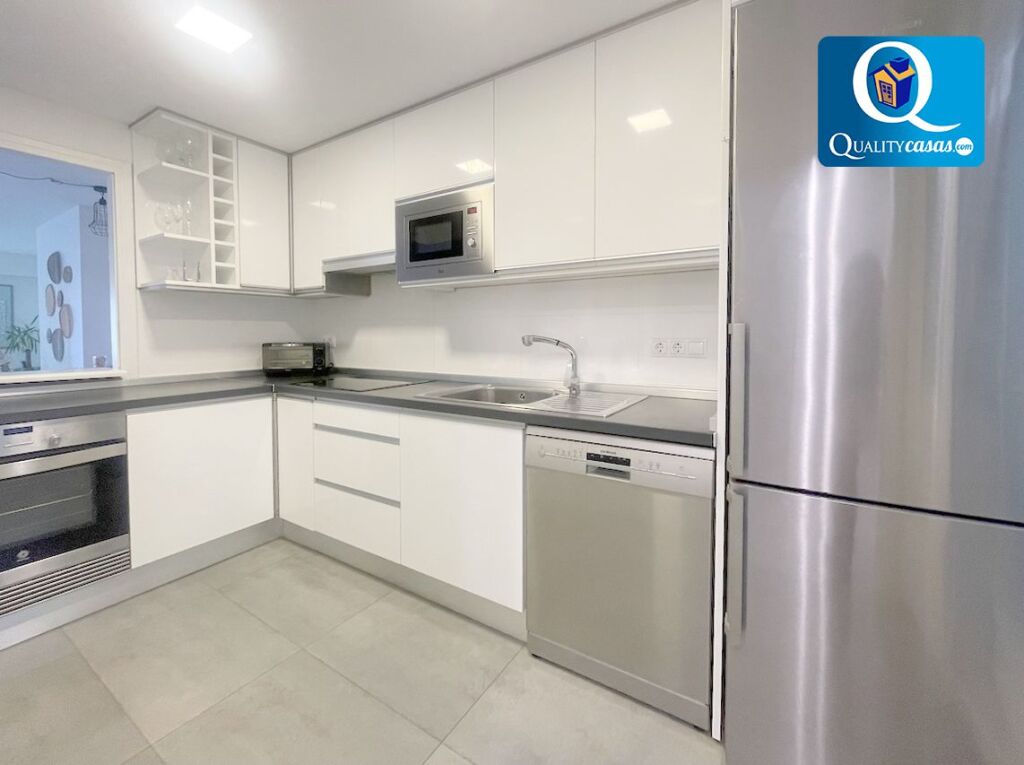 El amplio salón y luminoso salón, con dos orientaciones y dos ambientes, dispone de magnífica terraza con vistas despejadas a la avenida ajardinada y al mar. La moderna cocina office se integra en el salón compartiendo su luminosidad, se encuentra totalmente equipada y cuenta con electrodomésticos, disponiendo además de galería acristalada. La vivienda cuenta con 3 dormitorios con armarios empotrados y 2 baños completos.