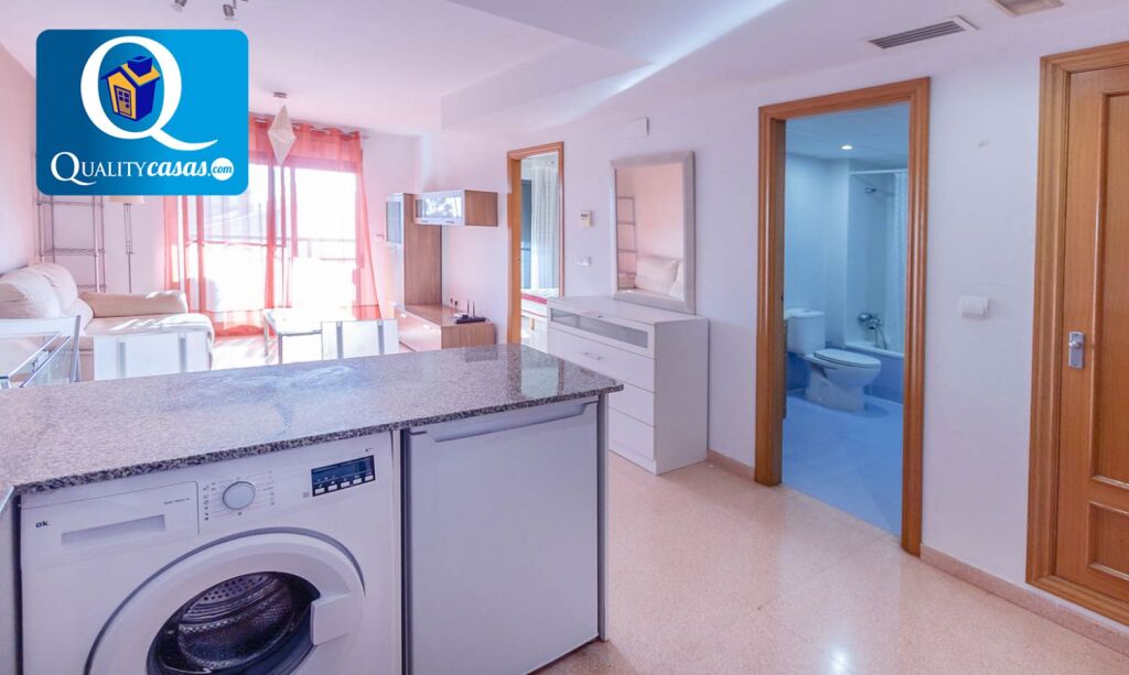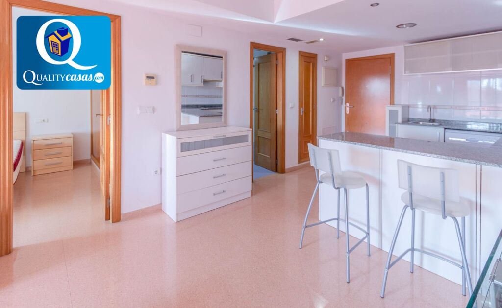 El luminoso salón, muy bien comunicado, dispone de fantástica terraza con vistas a zonas ajardinadas y cuenta con cocina office integrada, totalmente equipada y con todos los electrodomésticos. La vivienda dispone de 1 amplio dormitorio con armarios empotrados (comunicado con la terraza) y 1 baño completo.