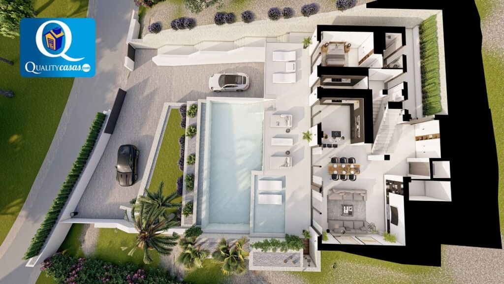 --- Dispone de cocina office amueblada y con electrodomésticos, luminosa, amplia y con vistas al jardín, integrada en el gran salón con ventanales integrales y vistas al espacioso porche terraza, la piscina y el jardín ----- Consta de 4 dormitorios y 3 baños completos (el principal en suite) ---- Cuenta con garaje privado, planta semisótano y gran terraza solárium de 136 m2 en planta superior ----