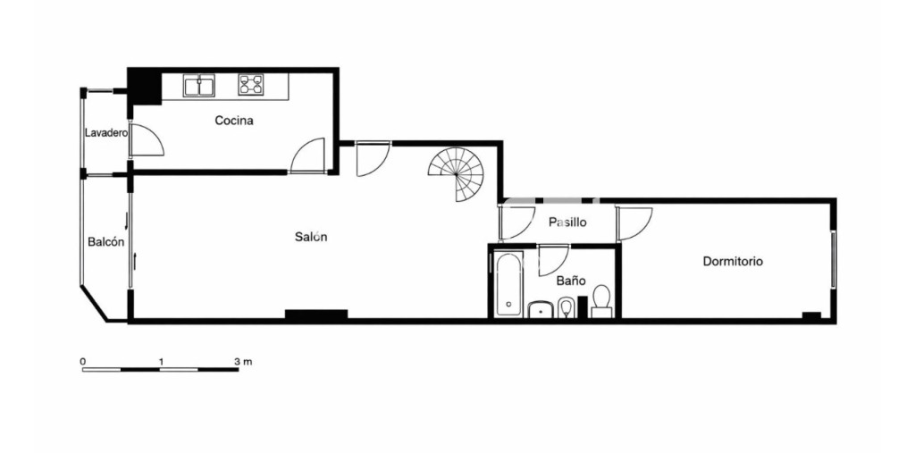 En la planta principal, se encuentra un salón-comedor luminoso con acceso a balcón, una cocina independiente con lavadero, un dormitorio y un baño completo. La segunda planta alberga un estudio o dormitorio principal tipo suite con baño privado y salida a terraza-solárium de 9 m², proporcionando un espacio exterior exclusivo.