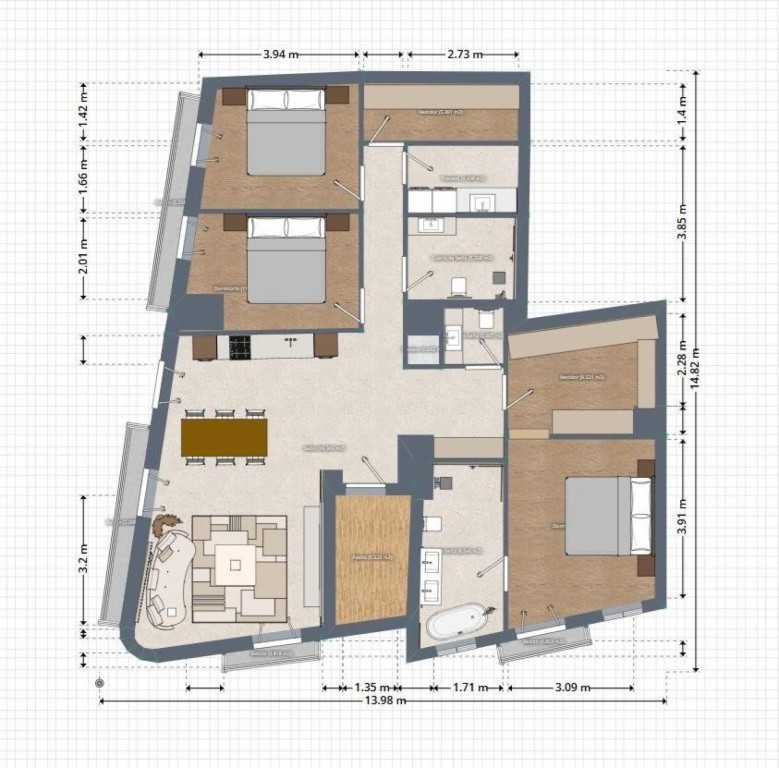 Dispone de 3 dormitorios dobles, destacando la suite principal con vestidor independiente y baño en suite, equipada con bañera exenta y ducha walk-in. La vivienda cuenta además con un segundo baño completo y un aseo de cortesía.