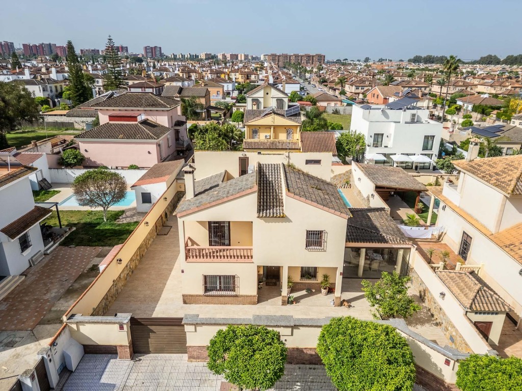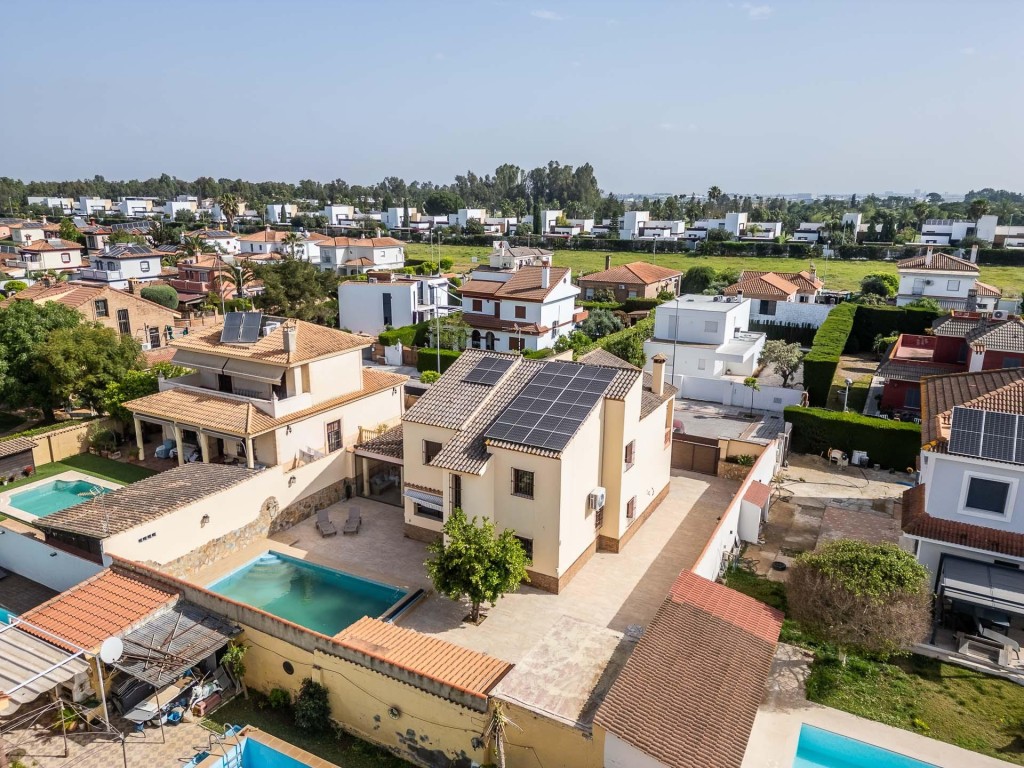 Exclusivo chalet independiente situado en una de las zonas más demandadas del Aljarafe, junto al Real Club de Golf de Sevilla. Vivienda ideal para quienes buscan tranquilidad, amplitud y altas calidades constructivas, a pocos minutos de Sevilla.La vivienda cuenta con 300 m2 construidos sobre una parcela de 700 m2, distribuidos en dos cómodas plantas.En planta baja encontramos un amplio y luminoso salón con chimenea, cómodo y confortable, cocina de diseñocompletamente equipada, con zona comedor, un dormitorio y un baño completo. Desde la cocina se accede a un magnífico porche cerrado con cortinas de cristal, perfecto para disfrutarlo durante todo el año.En la planta superior se ubican cuatro dormitorios con armarios empotrados y dos baños completos, uno de ellos dentro del dormitorio principal.La vivienda destaca por sus excelentes calidades: cocina de la rmarca Schmidt, baños con materiales de alta gama en porcelana, suelos de mármol, ventanas de aluminio con doble acristalamiento de seguridad, rotura de puente térmico, sistema oscilobatiente y mosquiteras.Además, dispone de aire acondicionado frío/calor en todas las estancias, sistema de placas solares con baterías de acumulación y puerta blindadade seguridad.En el exterior, la propiedad ofrece un cuidado jardín con piscina de agua salina, ducha con agua caliente, una segunda cocina de apoyo, además de cuarto lavadero y trastero independientes. Cuenta también con videoportero.Una vivienda lista para entrar a vivir, con todas las comodidades y en una ubicación privilegiada. No deje pasar esta oportunidad, le sorprenderá!! También disponible en alquiler por 6.000 €/mesEn cumplimiento de las obligaciones de información previstas Disp. final 3ª de la Ley 10/2025, de 28 de diciembre, de servicios de atención a la clientela y transparencia, así como en la normativa sectorial vigente, y RD 218/2005 de Inf. de la Junta de Andalucía, el precio indicado no incluye los gastos e impuestos inherentes a la adquisición, los cuales se desglosan estimados o con posibilidad de calcularlos a continuación; los gastos más ajustados serán dados en el D.I.A./F.I.S. en la visita a inmuebles, o antes.*Gastos de Notaría: La Minuta se calculará según al arancel notarial oficial: Anexo I, del Real Decreto 1426/1989, de 17 de noviembre del portal del Notariado. Enlace: https://notariared.com/calculadora-gastos-compra-vivienda/*Gastos de Registro de la Propiedad: La inscripción se facturará según el arancel oficial: ANEXO I, del Real Decreto 1427/1989, de 17 de noviembre. Igual enlace anterior*Gastos de Gestión (Gestoría): Los honorarios por la tramitación administrativa, liquidación de impuestos e inscripción registral ascienden de forma estimativa a [363 € aprox.] (IVA incluido), aunque depende de cada caso, y su dificultad.*Honorarios Agencia del Vendedor: incluidos en el PVP.*Honorarios Agencia del Comprador: 3% + IVA (21%) no incluidos en el precio de venta. La agencia prestará los servicios de mediación, asesoramiento y acompañamiento previstos en el Contrato de Prestación de Servicios y en el D.I.A./F.I.S. Si solicita servicios adicionales o personalizados, sus honorarios serán informados previamente, de forma individualizada y por escrito, conforme a la libertad de pactos y a la normativa vigente.*Si necesita Financiación: su banco le informará*Impuesto sobre Transmisiones Patrimoniales (ITP): Se aplicará el tipo impositivo vigente en Andalucía (generalmente el 7%, sin perjuicio de tipos reducidos del 6%. 3,5%, etc, aplicables según las circunstancias personales del comprador o las características del inmueble). El impuesto se devenga sobre el superior entre: 1.- Valor de Referencia de Catastro; y 2.- Precio de venta. Puede calcular su situación personal en el portal oficial de la A.T. de Andalucia. Enlace: https://www.juntadeandalucia.es/organismos/economiahaciendayfondoseuropeos/areas/tributos-juego/tributos/paginas/impuestos-cedidos-transmisiones.html