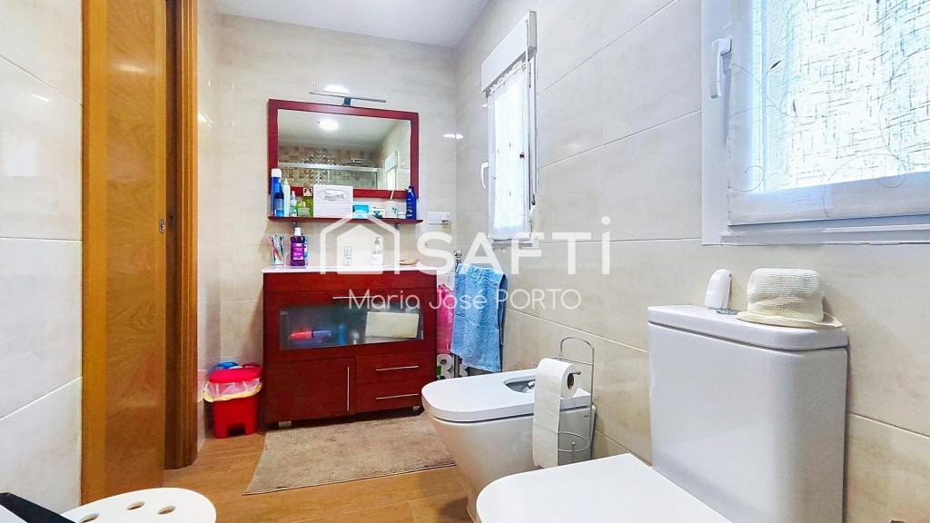 La planta superior dispone de tres dormitorios, un baño completo, una cocina completamente amueblada y una salita, lo que permite crear un espacio independiente para familia, invitados o incluso una segunda vivienda dentro de la misma casa.