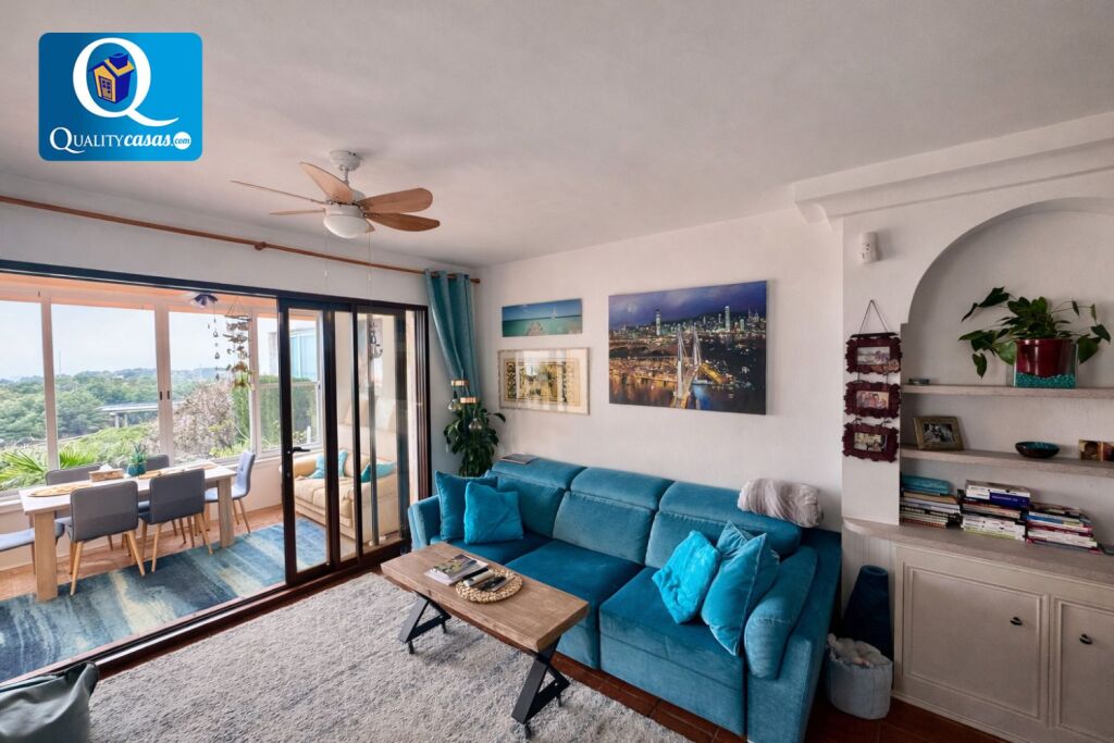 El porche terraza de entrada a la vivienda da paso al luminoso salón, con dos ambientes y terraza acristalada, magníficamente acondicionada y con inmejorables vistas. La cocina independiente, con vistas exteriores, se encuentra totalmente equipada y dispone de electrodomésticos. La vivienda cuenta con 2 habitaciones con armarios empotrados y 2 baños completos, disponiendo el dormitorio principal de terraza exterior.