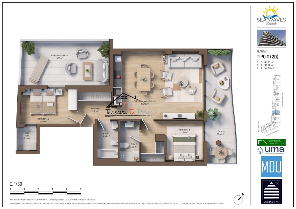 Residencial SEA WAVES Benicarló, la nueva obra de viviendas en primera línea de playa del Morrongo, es un proyecto que combina la modernidad con la cercanía a la naturaleza y al mar.Este exclusivo complejo residencial ofrece apartamentos de lujo con espectaculares vistas panoramicas al Mediterráneo, el complejo también incluye áreas comunes como jardines, piscina de estilo resort, gimnasio y aparca bicicletas.se distribuye en:2 dormitorios (el de matrimonio principal tipo suite con baño) + 2 cuartos de baño + salon - cocina + 3 terrazas + plaza de garaje + trastero + aparcamiento para bicicleta.Superficies: 101,55 m2 utilesVivienda 65,98 m2 utiles3 Terrazas 35,57 m2 utilesCocina completa equipada con frigorifico, lavadora, lavavajillas, horno, microondas, campana extractora y vitroceramica induccion.Incluye climatizacion por conductos con maquina frio/calor y aerotermia para agua caliente.Los futuros propietarios tendrán la opción de personalizar sus viviendas, y se ofrecen facilidades de financiación y formas de pago flexibles.También disponen de un tour virtual en realidad virtual y tenemos instalado piso piloto en nuestra oficina de ventas, ubicada junto al solar.¡No dejes pasar la oportunidad de reservar tu vivienda de obra nueva en el último solar de primera línea de Benicarló!El plazo de comercialización ya está abierto, así que solicita tu cita para ampliar información y descubre todo lo que Residencial SEA WAVES tiene para ofrecerte.